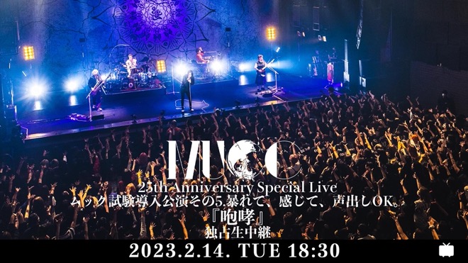 MUCCが東西二公演<MUCC 25th Anniversary Special Live ムック試験導入公演その5. 暴れて、感じて、声出しOK。『咆哮』>を開催中だ。この東阪公演より、2月14日のGORILLA HALL OSAKAライヴがニコニコ生放送で有料生配信されることが発表となった。