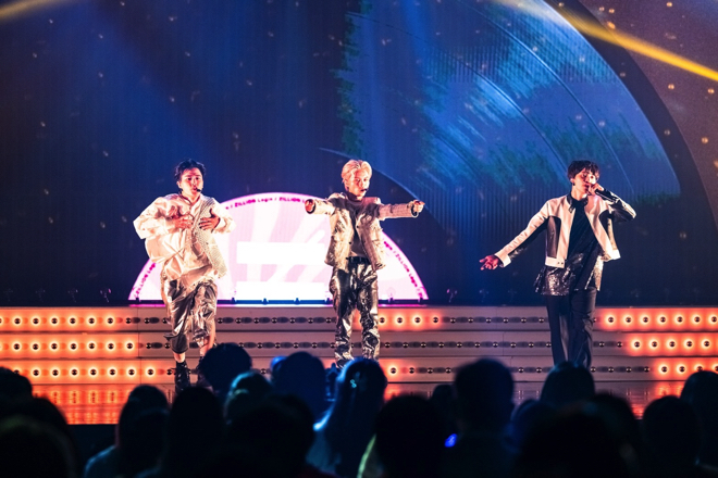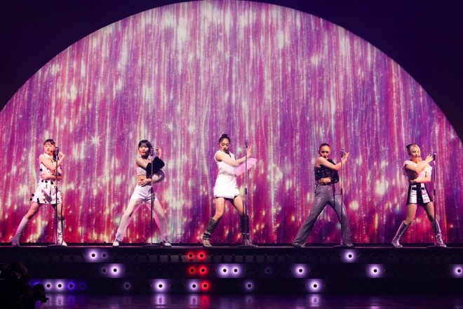 開演時間になると、ステージ全面を覆う紗幕にデジタルタイマーが映し出され、60秒のカウントダウンを始めるとともに場内がゆっくりと暗くなっていき、高揚感あふれるブレイクビーツに乗せて、メンバーが車や自転車でライブ会場に集合する映像からスタートした。続いて、サーチライトが交錯する中で紗幕が落ち、グループ名を模した電飾看板とともに横一列になったメンバーがステージに登場。モータウンサウンドをモチーフにしたレトロなソウルポップ「STEP」で派手に華やかにショウの幕を開けた。笑顔やグッドポーズのフリが印象的なオープニングナンバーでフロアをポジティヴなムードで満すと、Z世代らしくSNSがもたらすジレンマをユニークにコミカルに表現したナンバーを連発。速いパッセージの歌謡ソウル「やめとこっか」ではスマホの画面をスワイプし、エイティーズのフレーバーを加味したオントレンドなシンセポップ「NO盛れ NO LIFE」ではクラップを誘発し、1曲の中で8人編成から5人編成となるフォーメーションも展開。アウトロでのメンバー一人一人によるあいさつを経て、ケイジのビートボックスをフィーチャー。フリースタイルで繰り出される低音の効いたビートボックスをバックに、カシンとワタルがジャンルの異なるダンスをソロで踊り、男性メンバー3人によるオリジナルの90’S R&Bナンバー「Login」ではオーディエンスの心と体をメロウに揺らし、グループの多面性をアピールして観客を盛り上げた。