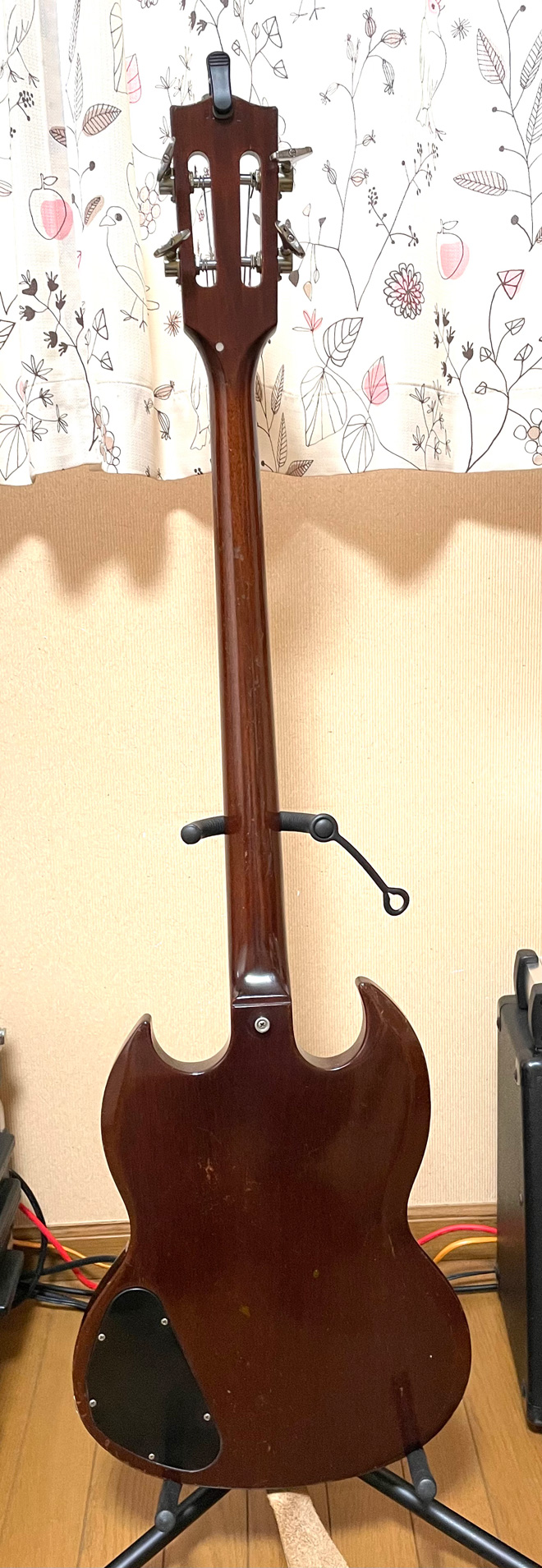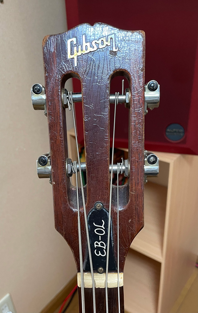 学生時代に3ピースバンドでベースを担当、当時好きだったクリームのジャックブルース、フリーのアンディフレーザーなどGibsonEB弾きに憧れ、偶然知人(バンド仲間)が足を洗うとのことで、確か5万だったかで譲り受けたベースがこれ。安かったのはネック裏上部にヒビが入り補修してあるからとのこと。音には全く問題なく、あの強力なハンバッカーの出力でベースアンプが歪み、バビ、ボビとらしい音が出ておりました。