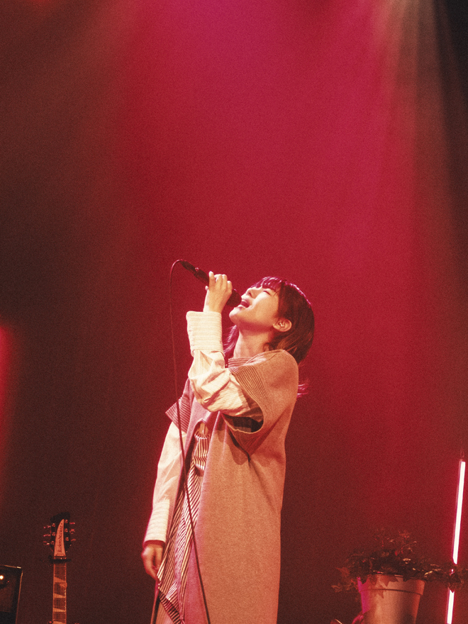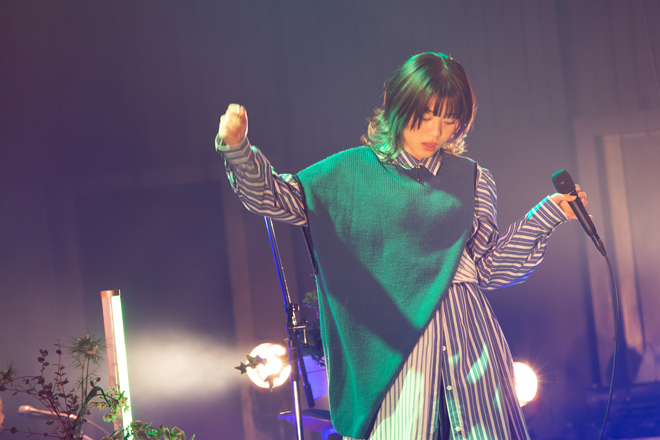 「今回初めて買ったエレキギターでさっそく(最初の)2曲をやったんですけど、もうこの後(ギターは)出てきません(笑)。最後まで、楽しんでいってください!」というMCで、少し緊張が解けた様子。タイトなビート、凛としたメロディが響き合う「SELF HELP」、リズムを取りながらオーディエンスの手拍子を促し、カラフルに展開していく「のうのうた」を気持ちよさそうに歌う姿も印象的。昨年9月に行われた初ワンマンのときに比べ、ステージで歌うことをしっかりと楽しめているようだった。
