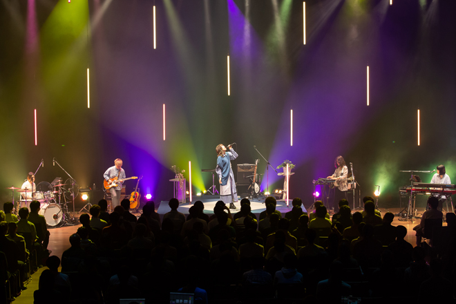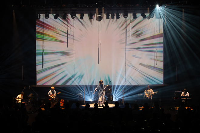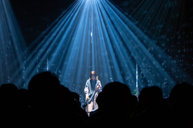 本編ラストは、「さらば、私の星」。スタジオジブリの短編映画「星をかった日」にインスパイアを受けて制作されたこの曲は、地元の広島から音楽をやるために上京した彼女の経験と結びついてる。「肌に合う場所で生きようよという曲です。そのおかげで、地元に帰ったときに“私はここで生まれてきてよかったな”と思えるようになりました」という言葉、MVのアニメ映像をバックにした演出、ひとつひとつのフレーズに思いを込めた歌声によって、会場全体が豊かな感動で包み込まれた。