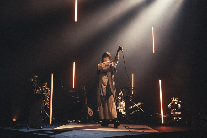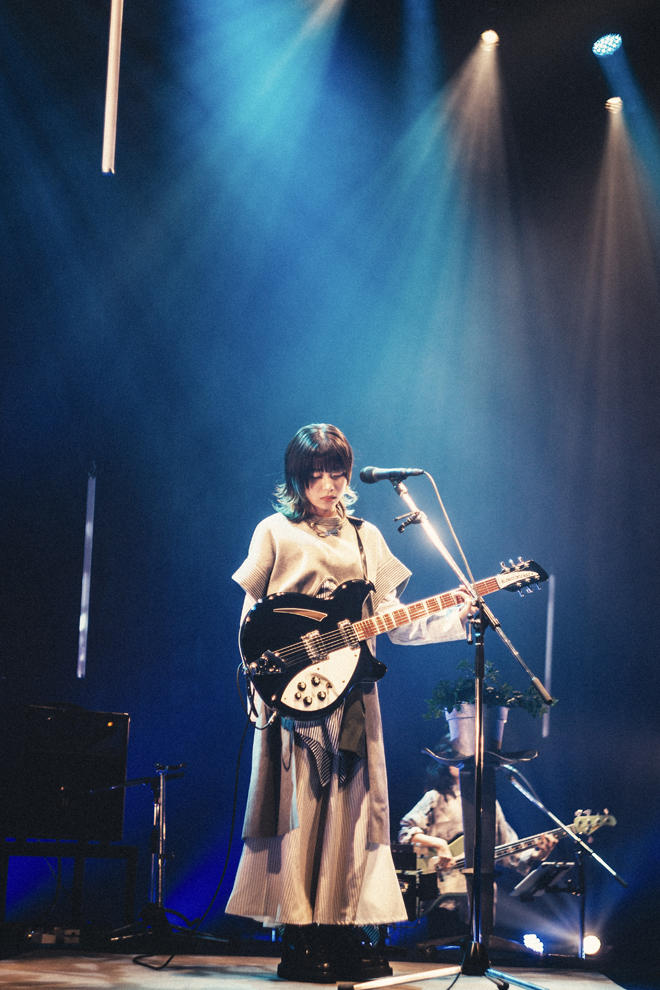 「2月1日にEP『健やかDE居たい』を配信しました! ただ、実は1月ごろの私はぜんぜん体調がよくなくて、健やかでいれなくて(笑)。EPを配信したことによる神様のイタズラかなって思ってたんですが、今は元気にこうやってみなさんに会えて、ライブができるのを嬉しく思います」と語り掛けると、会場からはさらに大きな拍手が。ステージと客席の距離がグッと近づいた後、気持ちのいい朝を想起させる「Sugar morning」、そして、オルタナティブな音像、〈解ってこれが最後/胸にある少しの期待に縋って生きる〉という歌詞が鮮烈なインパクトを残した「僕らの永夜」を披露した。