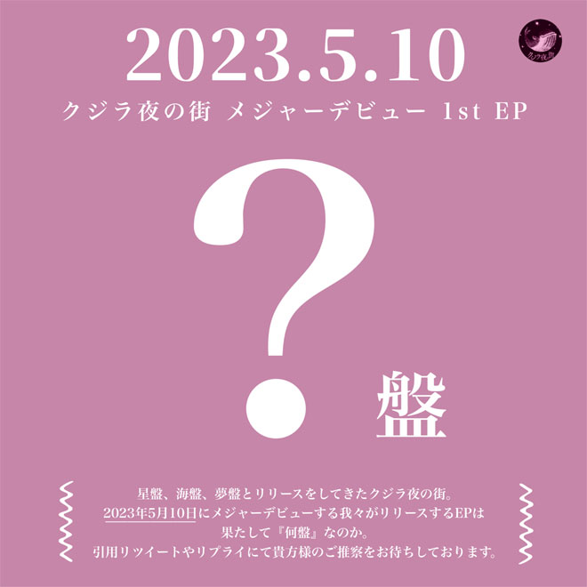 リリースを記念してデビューEPのタイトルを当てるクイズ企画も本日よりスタート。この企画では、クジラ夜の街オフシャルTwitterアカウントから投稿されたツイートに、予想したタイトルを引用リツイートすると参加が完了する。なお、正式タイトルの発表は3月14日ホワイトデーを予定している。