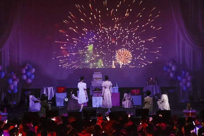 チャイムの音と共に、浪江女子発組合オリジナルのOvertureが鳴り響き、それぞれ誕生日パーティーをイメージした衣装でメンバーの8人が登場。記念すべき合同生誕祭の1曲目を飾るのは、浪江町の伝統的なお祭り“安波祭(あんばまつり)”がテーマとなっている疾走感溢れるナンバーの「ミライイロの花」。冒頭では、メンバー同士グラスを持ち乾杯をして、生誕祭がスタートした。1曲目からボルテージをあげるメンバーに負けじと、参戦しているファンの熱量も上昇し会場はすぐにあったまった。続けて、昨年リリースされたファーストアルバム『花咲む』のリード曲にもなっている「ハレノヒの足跡」をパフォーマンス。途中あーりんからバースデーケーキが運ばれてくると、後輩メンバー全員でろうそくの火を消し、仲良くあーりんからのケーキを頬張った。仲睦まじい光景に、ファンからもお祝いの拍手が送られた。