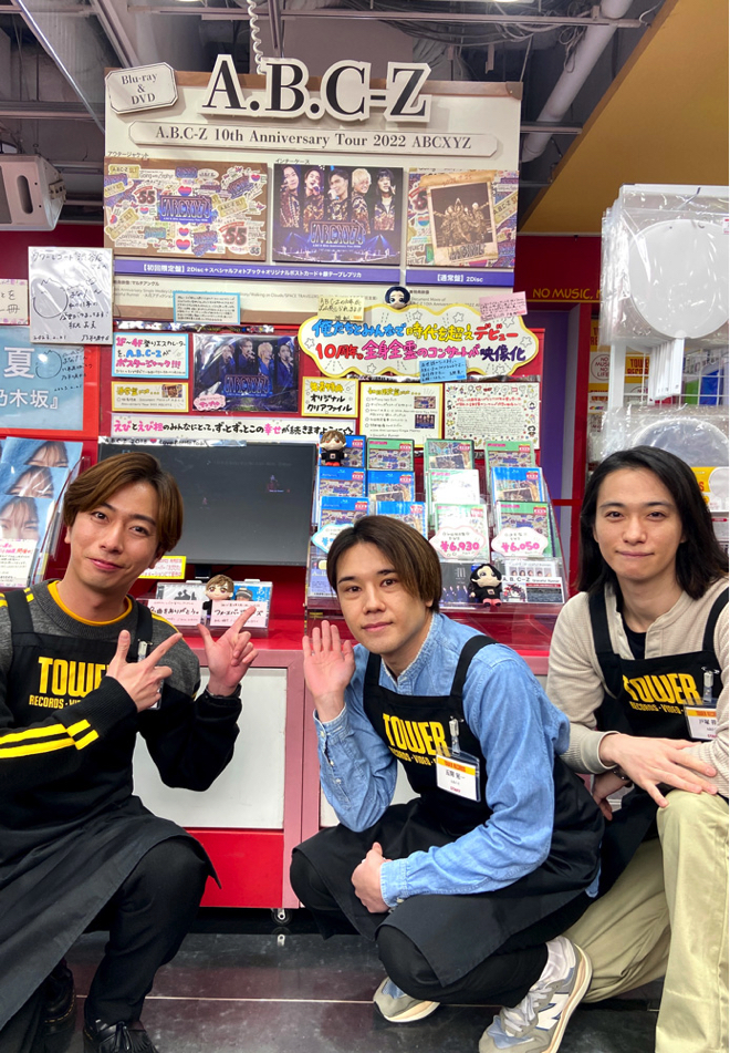 A.B.C-Zが、デビュー10周年記念コンサートのBlu-ray&DVD『A.B.C-Z 10th Anniversary Tour 2022 ABCXYZ』を2月22日にリリースする。発売前日である21日、メンバーの戸塚祥太と河合郁人、五関晃一がサプライズで東京都内のレコードショップを訪問した。