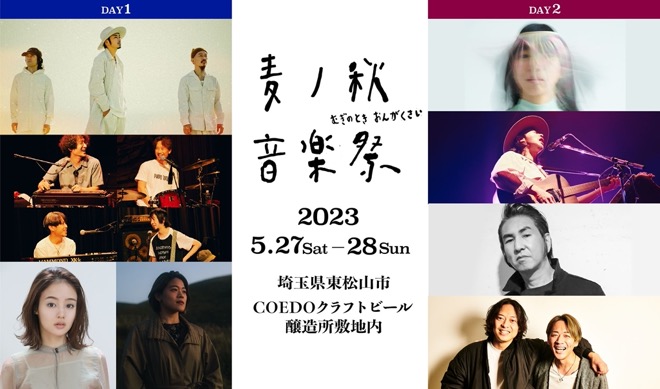 キャンプ型音楽フェス<麦ノ秋音楽祭 2023>が5月27日および28日の2日間、埼玉県東松山市のCOEDOクラフトビール醸造所敷地内で開催されることが発表となった。同時に第一弾出演アーティストもアナウンスされている。