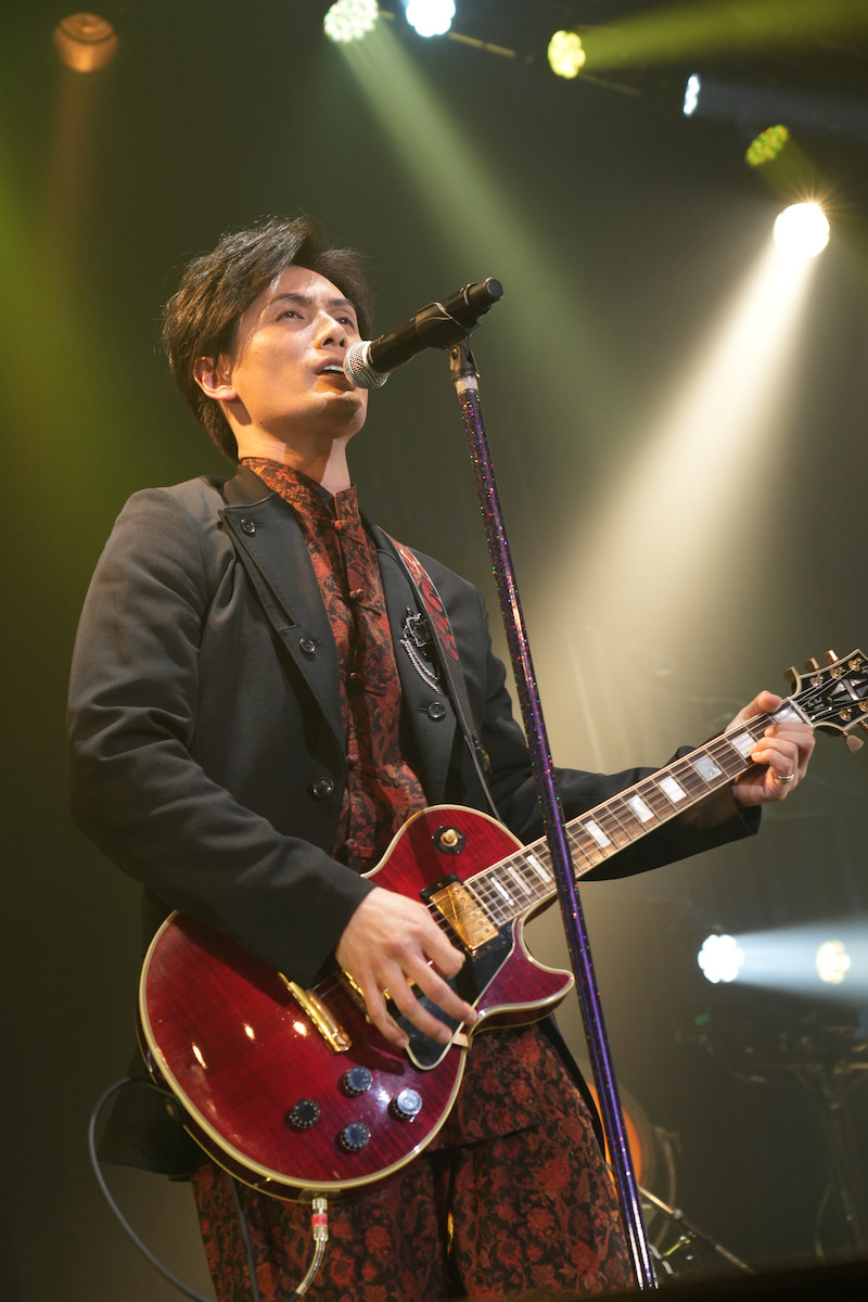 MCでは、現在公演真っ最中のミュージカル「キングアーサー」の話題から、次回作であり、待望の再演となる舞台「BACKBEAT」についてもトークを展開。「BACKBEAT」はビートルズの創世記を描いた舞台ということでゆかりの楽曲が多数演奏されるのだが、今回はそれにちなんで、加藤自身もエレキギターを弾きながら「Jonny B.Goode」と「ROCK AND ROLL MUSIC」の2曲を披露した。ロックンロールの名曲で盛り上がった後は、降り積もる雪のような真っ白いライトが冬気分を演出した「Brilliant snow」を堪能。その後はカバー曲として、山崎まさよしの「One more time,One more chance」、ジョー・リノイエの「それだけしか言えない」、そしてラテンテイストでアレンジされた西城秀樹の「ギャランドゥ」でオーディエンスを魅了した。
