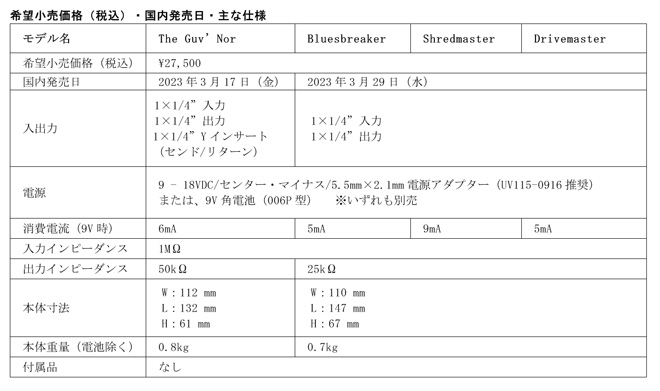マーシャル創立60周年記念を記念し、「The Guv’Nor」「Bluesbreaker」「Shredmaster」「Drivemaster」の4モデルが、復刻版として国内数量限定で発売となる。