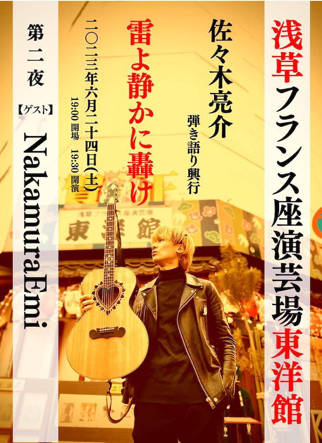 <雷よ静かに轟け>は、佐々木亮介が毎回ゲストを迎え弾き語り2マンライブを行うイベントだ。普段は漫才や漫談などが中心の伝統ある演芸場「浅草フランス座演芸場東洋館」で行われる。