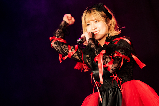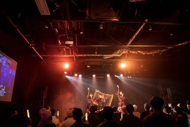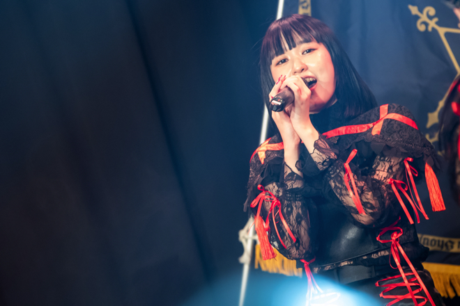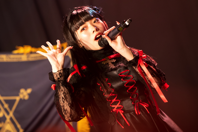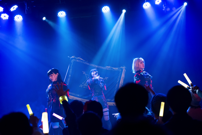 この日の「X-HALL -ZEN-」は満員御礼。想定人数をオーバーしたため5分遅れての開演となった。オーケストラ&サイバーパンクなオープニング映像が流れ出すとファンは総立ちとなり熱気に包まれる中、Meiと新メンバーのAnji、Nanaが登場。「ボヘミアン・ラプソディ」のようなプログレッシブナンバー「Look alive」の轟音ギターと共に本編はスタート。都市伝説を謳い上げる「Fake」、「偶像連鎖」とiTunesメタルチャート1位を記録した楽曲達を13分ノンストップでパフォーマンス。圧巻の幕開けに冒頭からファンは熱狂と化した。