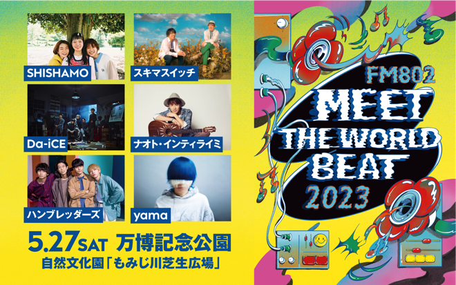 FM802が主催する<MEET THE WORLD BEAT>は1990年、コーポレートアイデンティティである「Meet the music on the radio」を体現するイベントとして、「ラジオで音楽を伝え、ライブでアーティストを伝える」という理念のもと誕生した。2023年の公演には、SHISHAMO、スキマスイッチ、Da-iCE、ナオト・インティライミ、ハンブレッダーズ、yamaの6組が出演する。