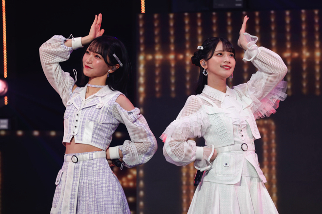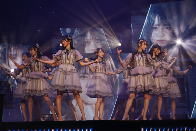 その後はユニット曲、ソロ曲のパフォーマンスが続く。佐々木舞香、野口衣織、諸橋沙夏による“本気の愛を願いながらも、曖昧な関係から抜け出せない、複雑な心境”を描いた大人の恋愛ソング「知らんけど」、会場をペンライト青色一色に染め上げた高松瞳のソロ曲「僕のヒロイン」、佐々木舞香のソロ曲「真夜中マーメイド」とユニット、ソロ曲ならではのパフォーマンスでオリジナリティー溢れるパフォーマンスで魅了。