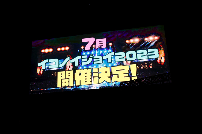 その後、ステージスクリーン上に急遽「特報」が放映される。7月29日、30日の2日間にわたり、=LOVE、≠ME、≒JOYの3組による合同フェス<イコノイジョイ 2023>が富士急ハイランド コニファーフォレストにて開催されることがサプライズ発表された。