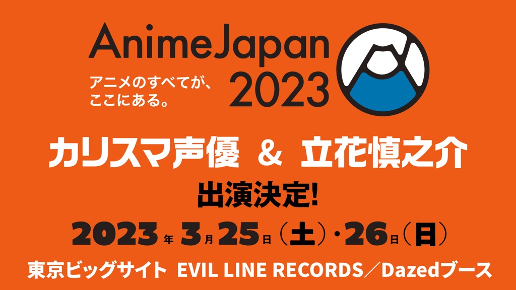 なお、立花慎之介は3月25日(土)・26日(日)に東京ビッグサイトで開催される<AnimeJapan 2023>の「EVIL LINE RECORDS/Dazed」ブースでのイベントステージにゲスト出演する。本イベントでは、同ブースで展開する『ヒプノシスマイク –Division Rap Battle-』のキャストを招く “コラボコーナー”の実施も予定しており、会場観覧のほかYouTubeでの無料生配信も行われる。