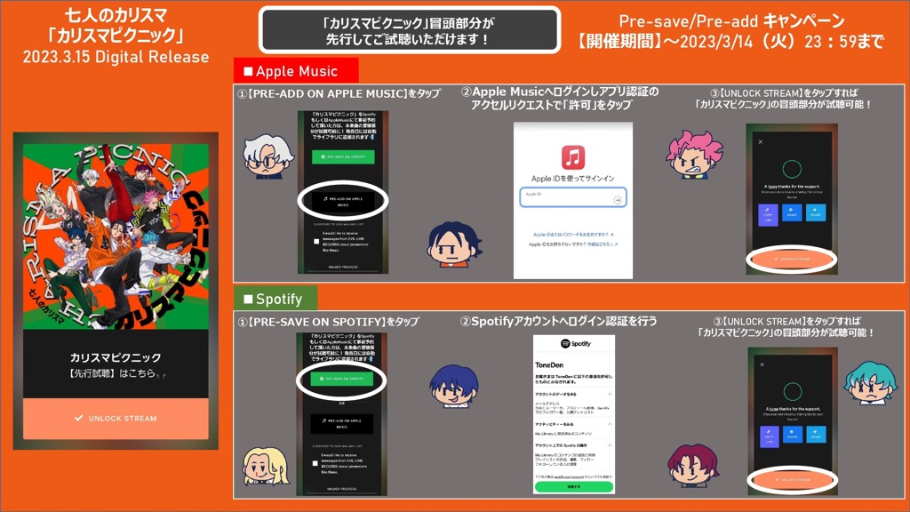 「カリスマピクニック」をキャンペーンURLから配信事前予約(Pre-Add / Pre-save)すると本楽曲の冒頭部分を先行して聴くことができるキャンペーン実施中。
