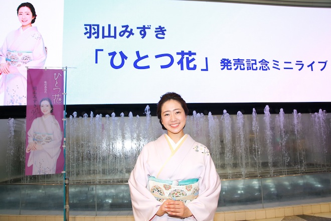 羽山みずきは3月8日に発売になる「ひとつ花」を披露したほか、同じレコード会社の先輩にあたるイルカの「なごり雪」などを披露。大人の色気だけでなく、女性としてのしなやかさも備えた羽山みずきの歌唱に、涙する観客も。新曲の意気込みに関して「新しい羽山みずきの一面をお客様に観ていただけるように頑張っていきたいと思います」と話した。