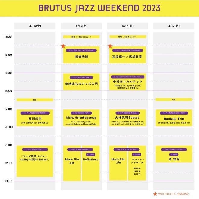 ポップカルチャー誌『BRUTUS』が、南青山BAROOMにて、2023年4月14日(金)〜4月17日(月)の4日間<BRUTUS JAZZ WEEKEND 2023>を開催する。