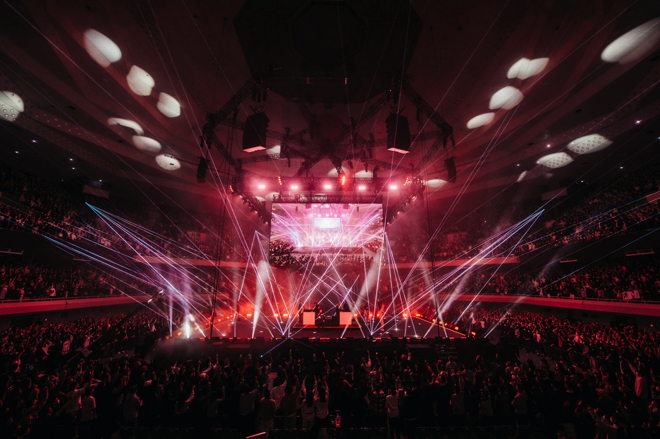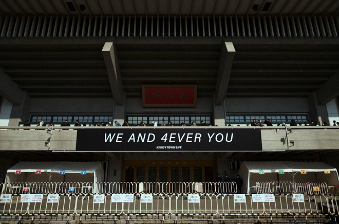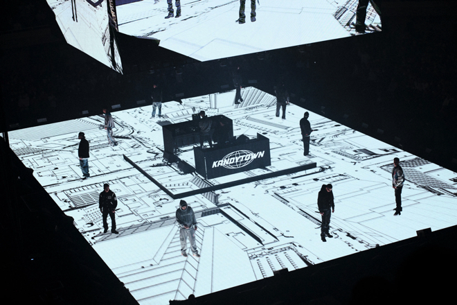 2023年3月8日、この日をもってヒップホップクルー:KANDYTOWNはその活動の終演を迎えた。終演を飾るのは、<LAST LIVE>と銘打たれた最後の単独公演。KANDYTOWN単独公演としては初となる武道館での公演。アリーナの中央に鎮座するステージは、周りを360度客席に囲まれ、大所帯クルーとしての魅力を余すことなく伝えるには格好の設計だ。上部には大画面のLEDスクリーンが、床面にも一面のLEDスクリーンが設られており、その佇まいはさながら外界とは異なる空気が流れる神殿のようにも見える。