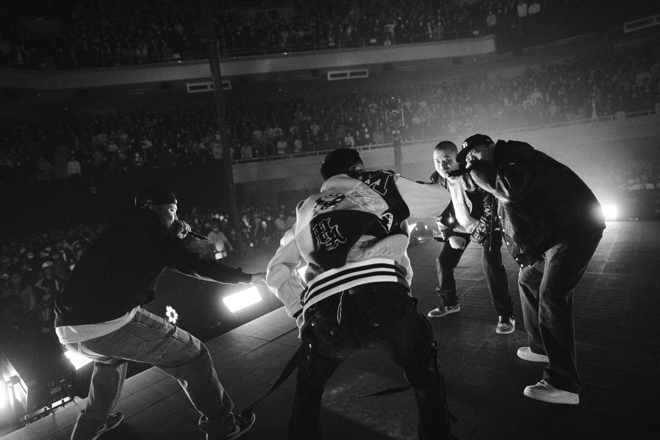 開演予定時刻を少し過ぎた頃、会場の照明が全て落とされた瞬間に観客席から割れんばかりの歓声が起こる。続いて、客席から照らされるスマホの明かりの渦が会場を包む。舞台上には二基のDJブースが設置され、指揮を執るのはクルー内のDJであるWeelowとMinnesotahだ。客席からの期待の渦が会場全体を包み込むころ、まず流れ始めたのは「Curtain Call」のイントロだ。続いて、ステージ上にはKEIJU、Ryohu、そしてIOの3名が現れる。「Curtain Call」は3rdアルバムにして最後の作品となった『LAST ALBUM』から発表されたリードシングル楽曲でもあり、自らその幕を引こうとするKANDYTOWNのメンバーらの心境をそのまま代弁したような曲、いわば、この日の武道館ライブに向けたアンセムともいうべき重要曲だ。客席からは合唱の嵐が聴こえ、完璧なスタートを切るに相応しい一体感が生まれた。続いて、「You Came Back」、「Last Week」と楽曲が進むにつれてステージ上のメンバーが増えていき、続く「Soul Assassin」が会場に鳴り響く頃には、先述の3名に加えてBSC、DIAN、Dony Joint、Gottz、Holly Q、MUD、そしてNeetz、MASATOらが揃い、メンバー全員がステージに並ぶ。前半は、主に『LAST ALBUM』と2ndアルバム『ADVISORY』からの楽曲で構成される。それぞれのヴァースをしっかりと聴かせるように、マイクパスが繰り広げられる。