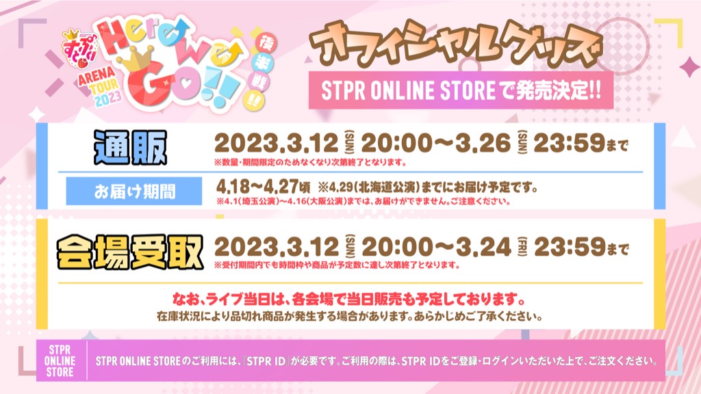2023年3月12日(日)からSTPR ONLINE STOREにて、アリーナツアー後半グッズの受付を開始しました。通販、会場受取ともに数量限定。受付期間内でもなくなり次第終了となります。