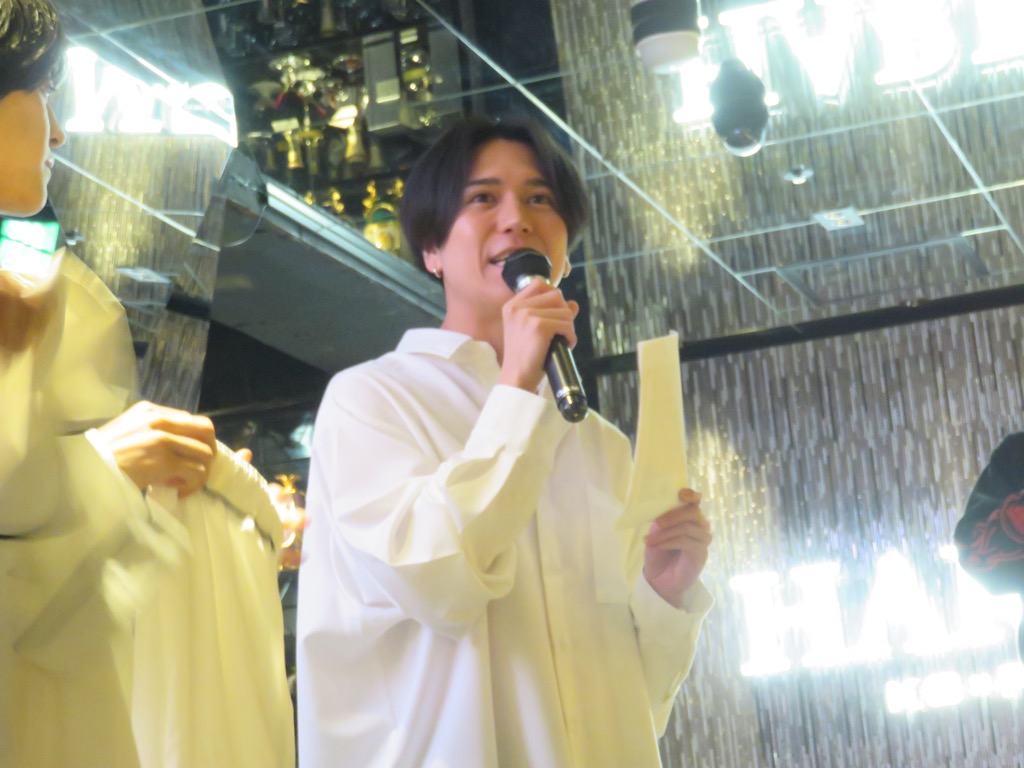また、リーダーのKEITYは「僕とUTAが歌うデュエット曲「歌舞伎町の夜は更けて」という曲を今回僕たちで歌わせていただけることになりました!演歌です。しかも、しかもなのですが作詞もさせていただき、僕たちが伝えたいことや僕たちの⼈⽣、想いを詰めました!!」と作詞に初挑戦したことも話した。