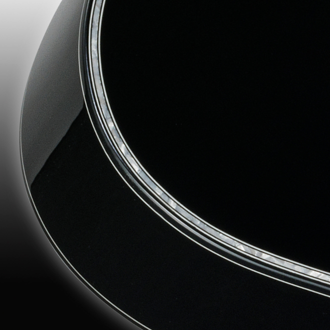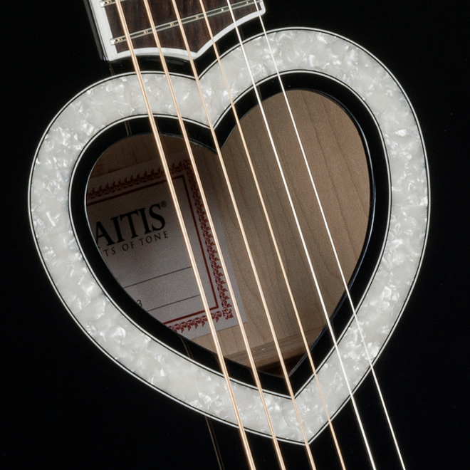 AAJ-2500HPH-Eは、精悍なブラックのボディー・カラーが魅力で、ゼマイティスならではの伝統的なハート型サウンドホールの周りに、ホワイト・パーロイドの特徴的なロゼッタを採り入れたモデル。