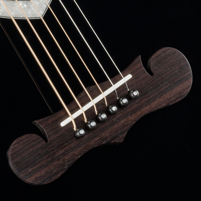 ボディー・トップは単板のシトカ・スプルース、サイド&バックは単板メイプルで、Xブレーシングを採用。また、エボニーのブリッジ・ピンや、ヘッドとネックに施されたホワイト・バインディング、ボディー・トップ&バックのブラック&ホワイト・バインディング、トップのパーロイド・パーフリングが特徴だ。