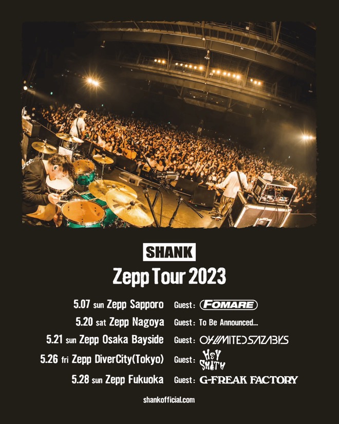SHANKが5月より<Zepp Tour 2023>を開催する。同ツアーの大阪公演に04 Limited Sazabysがゲスト出演することが発表となった。
