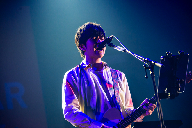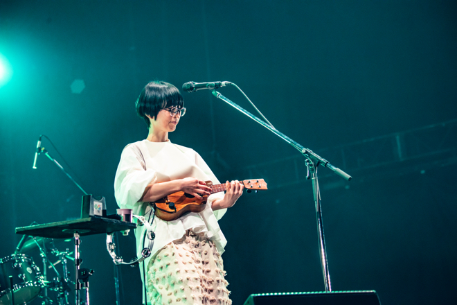 ウクレレのメロディに心洗われる「クローバー」が始まると、会場の空気がいきなり変わる。外はあいにくの雨模様だが、パッと晴れ間が広がるような歌声に癒される。踊るような鍵盤、跳ね回るリズムが快活に響き渡る「春風」を、タンバリンを叩きながら歌う姿が印象的だ。