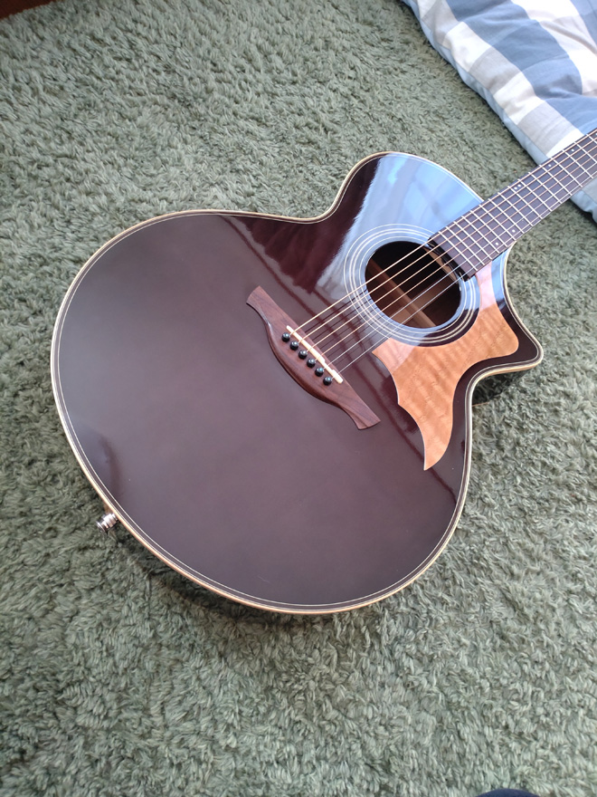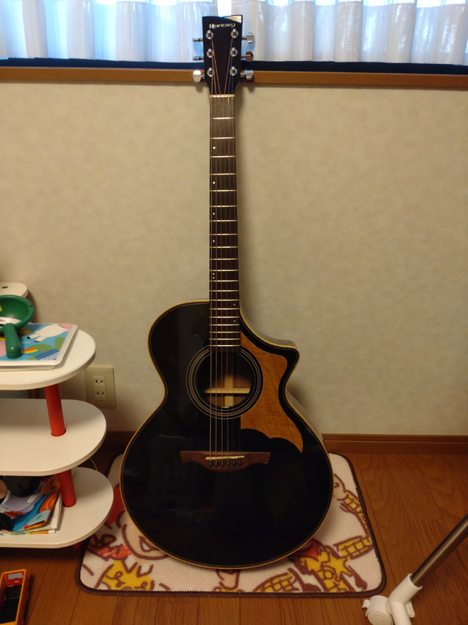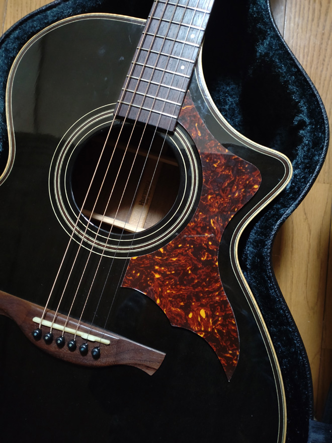 久しぶりの投稿です。Taylor314CEと迷って購入した島村楽器のこのモデル、私が新品購入した当時はピックガードが無く、自分でアコギ用ピックガード材を切って貼り付けていました。(4枚目の写真かな)