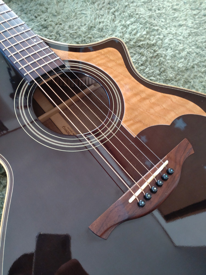 しかし黒ボディってアコギ用ピックガードだと、黒が透けてピックガード材の色が映えないんです。そこで最近、木製ピックガードを目にするようになり、気になってネットで調べてたら木材にアクリル板を貼り付けたピックガードを作っているお店を見付けて依頼、取り付けしました!