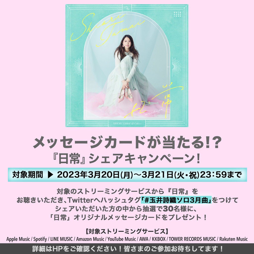 リスニングシェアキャンペーンでは対象のストリーミングサービスから新曲「日常」を聴き、Twitterへハッシュタグ「#玉井詩織ソロ3月曲」をつけてシェアした方の中から抽選で30名に「日常」オリジナルメッセージカードがプレゼントされる。