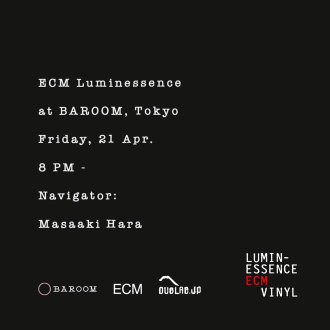 ECMが世界3都市のHi-Fiバーで企画するリスニング・イヴェントです。アナログ・マスターテープからカットされるLuminessenceというヴァイナル・リイシュー・シリーズをより良い音でじっくりと楽しんでほしい、という企画意図を汲み取って、僕は当日ジャズ喫茶の店主よろしく真摯にレコードをかけて、2枚のレコードについても話します。BAROOMのサウンドは本当に素晴らしいです。ぜひ、この機会に気軽にお立ち寄りください。