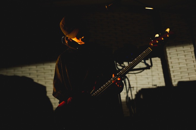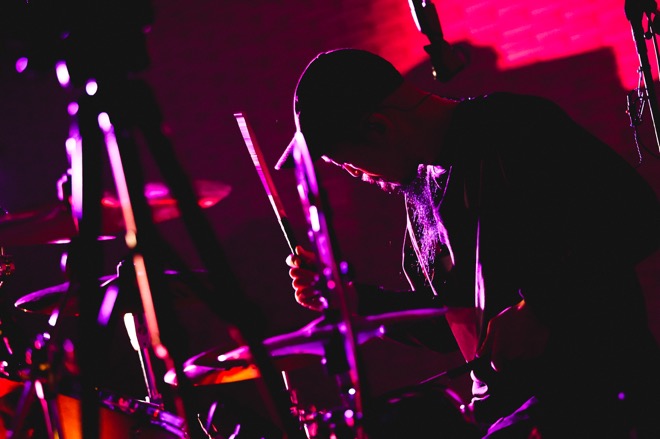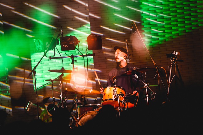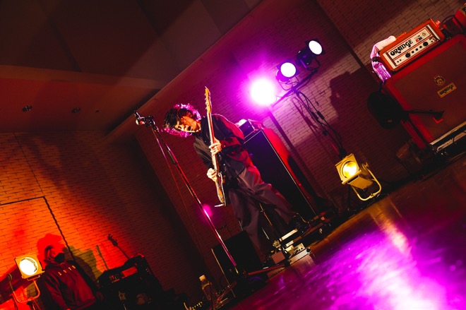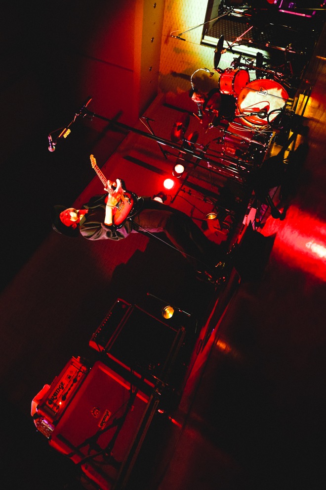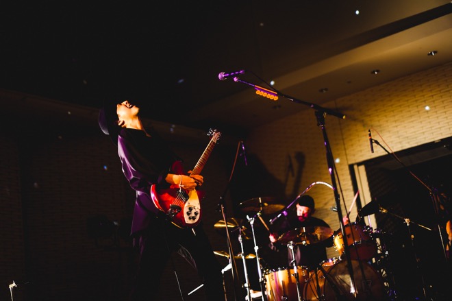 一瞬の静寂の後、大木が静かにギターを奏で始める。コードやフレーズをループに重ね、幻想的なアンビエントサウンドで、ゆっくりと会場を優しく染めていく。まるでこの地に捧げるレクイエムのように。そこへ、ボリューム奏法によるベース、原始的な鼓動を感じさせるドラムが加わり、美しいアンサンブルでさらに神聖な空気へ。