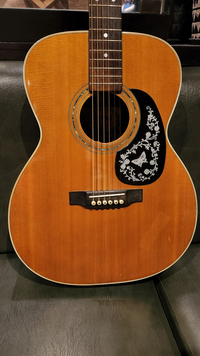 けっこう汚れていたのでクリーニングをしてピックガードは剥がれていたので交換。音はマーチンのようなきらびやかな高音が出ます。多少ローが弱いかなと。ラウドに弾くよりも優しく爪弾く感じが合います。