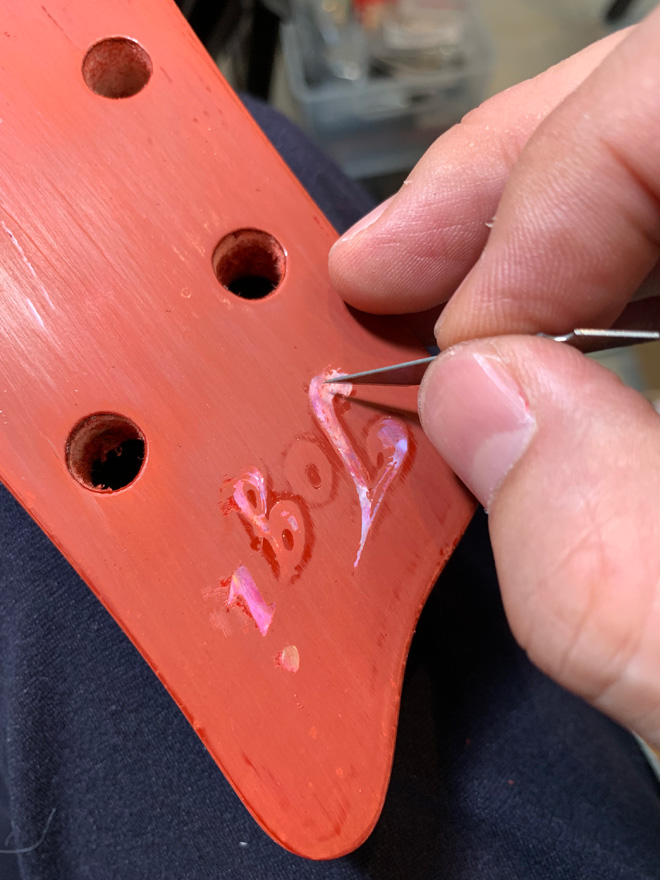 東儀:息子のはP-90とハムバッキングでダイナミックトレモロ仕様だけど、僕のはフロントもリアもP-90でストップテールピース。ロゴも全部貝で作りました。螺鈿でインレイを埋め込んだので本格的ですよ。バインディングも全部セルを巻きましたし。
