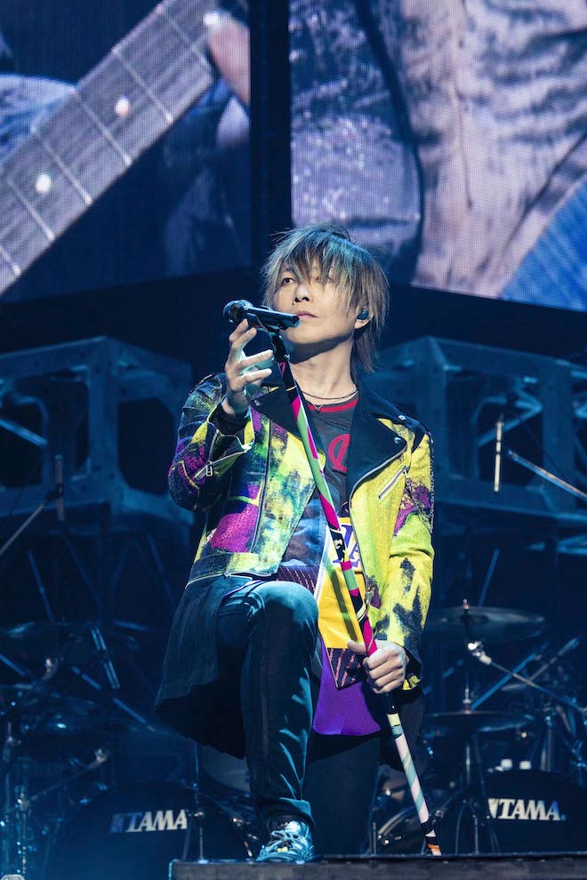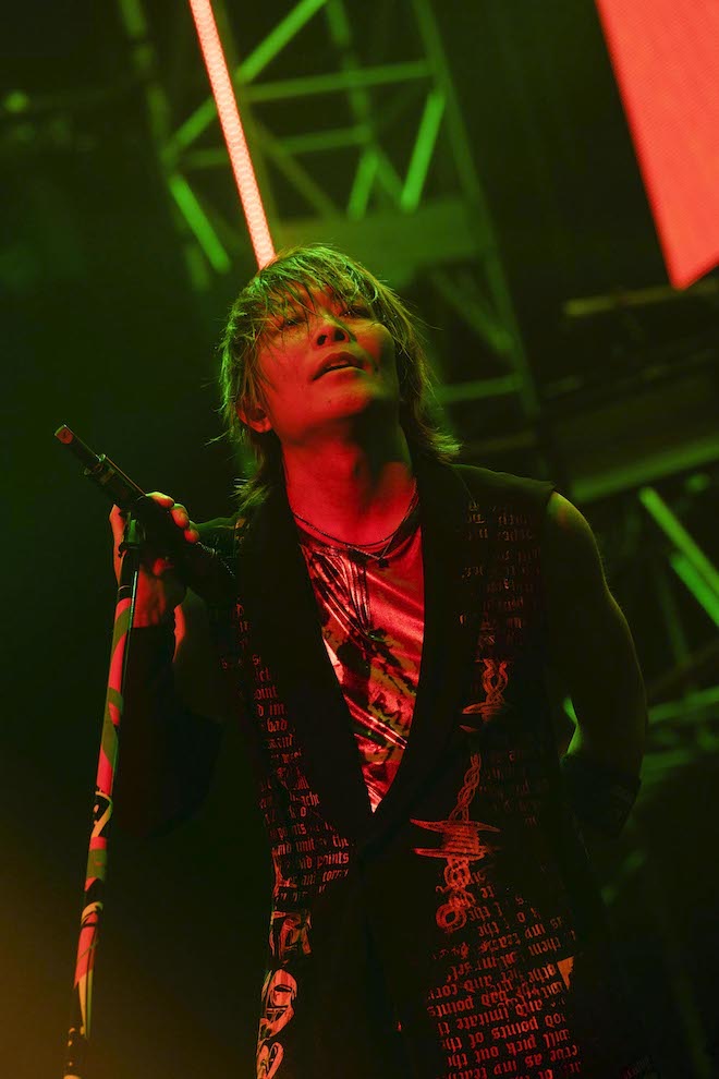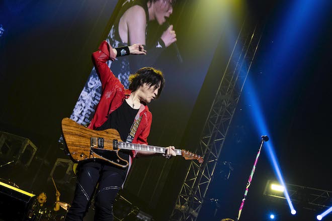 沸き立つ熱を一度冷ますように、クールなBGMと共にLEDビジョンには雄大な銀河系が映し出される。そしてスケールの大きな宇宙を眼前にした武道館に響いたのは、この日のセットリスト中、唯一のミドルチューン、TVアニメ『機動戦士ガンダム 鉄血のオルフェンズ』第2期EDテーマ「少年の果て」。その壮大な静けさから、波打つジェットコースターは再びギアを上げて昇り出す。ダンサブルな「DARK SHAME」、激しく狂おしいラブソング「偏愛の輪舞曲」でスピードを上げ、『最遊記RELOAD』シリーズの2曲「move on! イバラミチ」と「カミモホトケモ」で、KISHOWが華やかな扇子を振りながらオーディエンスを煽る。