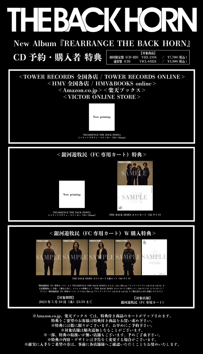 「銀河遊牧民(FC専用カート)」より『REARRENGE THE BACK HORN』および『Live Blu-ray「マニアックヘブンvol.13 & vol.14」』を期間内に予約・購入した方に、スペシャル特典として「THE BACK HORN ポストカード4枚セット」(A6サイズ)をプレゼント。