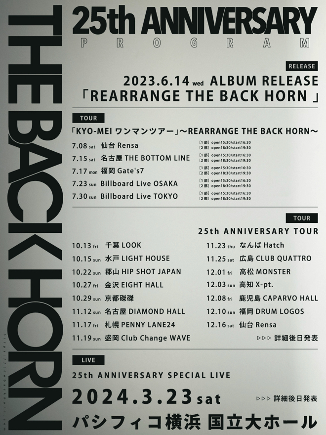 また、アニバーサリーツアー<THE BACK HORN 25th ANNIVERSARY TOUR>では10月13日の千葉・LOOKから12月16日の宮城・Rensaまで15公演が開かれる予定となっている。2024年3月23日には“アニバーサリーイヤーの集大成”として、こちらも自身初となる神奈川・パシフィコ横浜 国立大ホール公演も開催される。