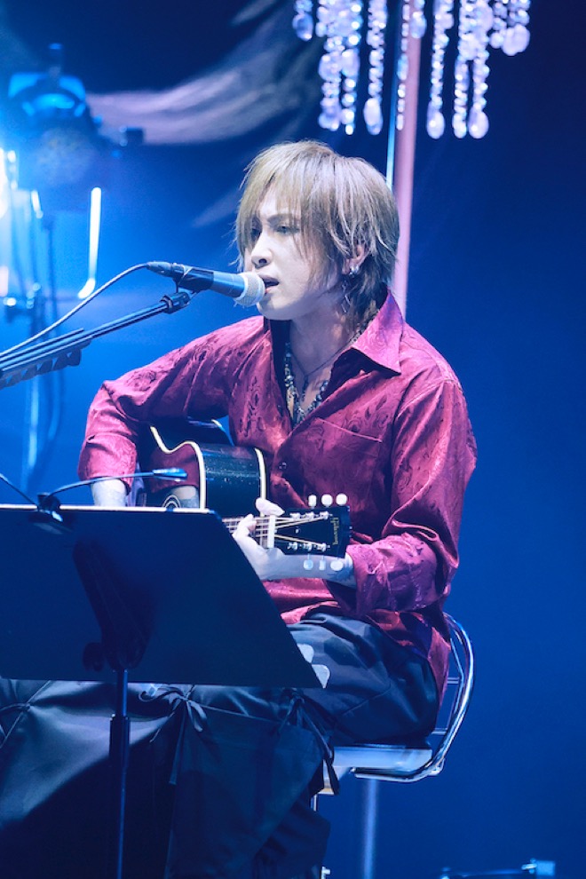 シャンデリアが煌めく舞台の中央にはKIRITOとギターのみ。Angeloの「BUTTERFLY」で幕を開け、KIRITOソロ名義、Angelo、PIERROT、それぞれから選出された楽曲たち全16曲が披露された。単純に言えば、これまでツインギターだったアレンジがひとり弾き語りになったわけで、音数が減ることはもちろん、装飾的なギターフレーズが省かれることとなる。この夜KIRITOは、主に弾き語りの基本であるギターストロークを奏で、歌ったのだった。<Phantom>公演においては、KIRITO曰く「ギターは歌のために最低限あるという感覚」とのことで、まさにそれがわかりやすい形で示される結果にもなった。すなわち歌で勝負する極致と言っていいだろう。