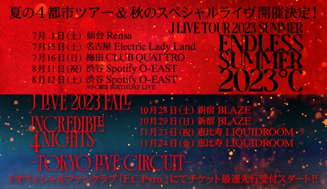 と告げられたアンコール。続けて、夏に4都市5公演のツアー<J LIVE TOUR 2023 SUMMER -ENDLESS SUMMER 2023℃->、秋にスペシャルライヴ<J LIVE 2023 FALL INCREDIBLE 4 NIGHTS -TOKYO LIVE CIRCUIT->を開催することも発表された。チケットの最速先行受付はJオフィシャルファンクラブ「F.C.Pyro.」にて4月15日より。コロナ禍というトンネルを抜けて、再び新たなドラマ始まる。