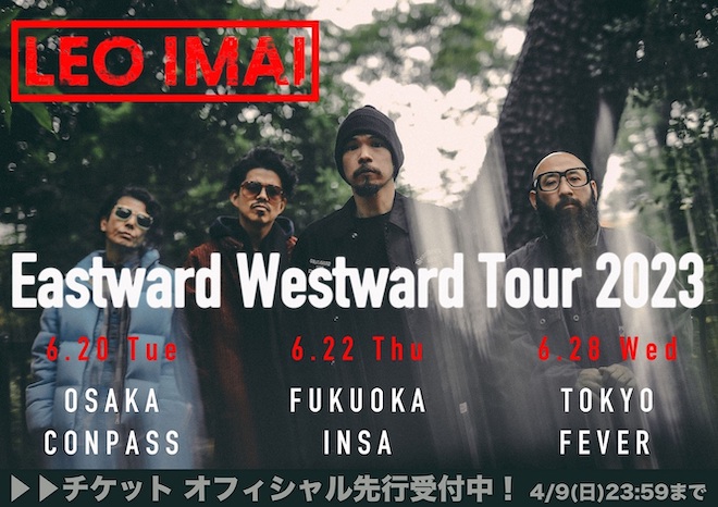 また、このデジタルEPリリースに向け、2019年に開催した<大都会ツアー>から約3年8ヶ月ぶりとなるツアー<Eastward Westward Tour 2023>の開催も決定した。同ツアーはバンド・LEO IMAIのワンマンツアーで、東京・大阪・福岡の三都市を巡る。