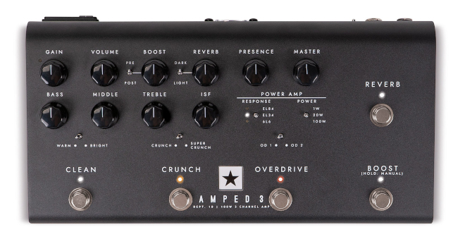 Dept.10 AMPED 3は、6つのボイシングと3つのプログラマブル・チャンネル、そしてリバーヴを備えた100Wのハイゲインのペダル型アンプ。BlackstarのヘッドアンプSeries Oneのような、マルチ・チャンネル真空管アンプに見られる超ハイゲイン・トーンを求めるプレイヤーに最適のものだ。
