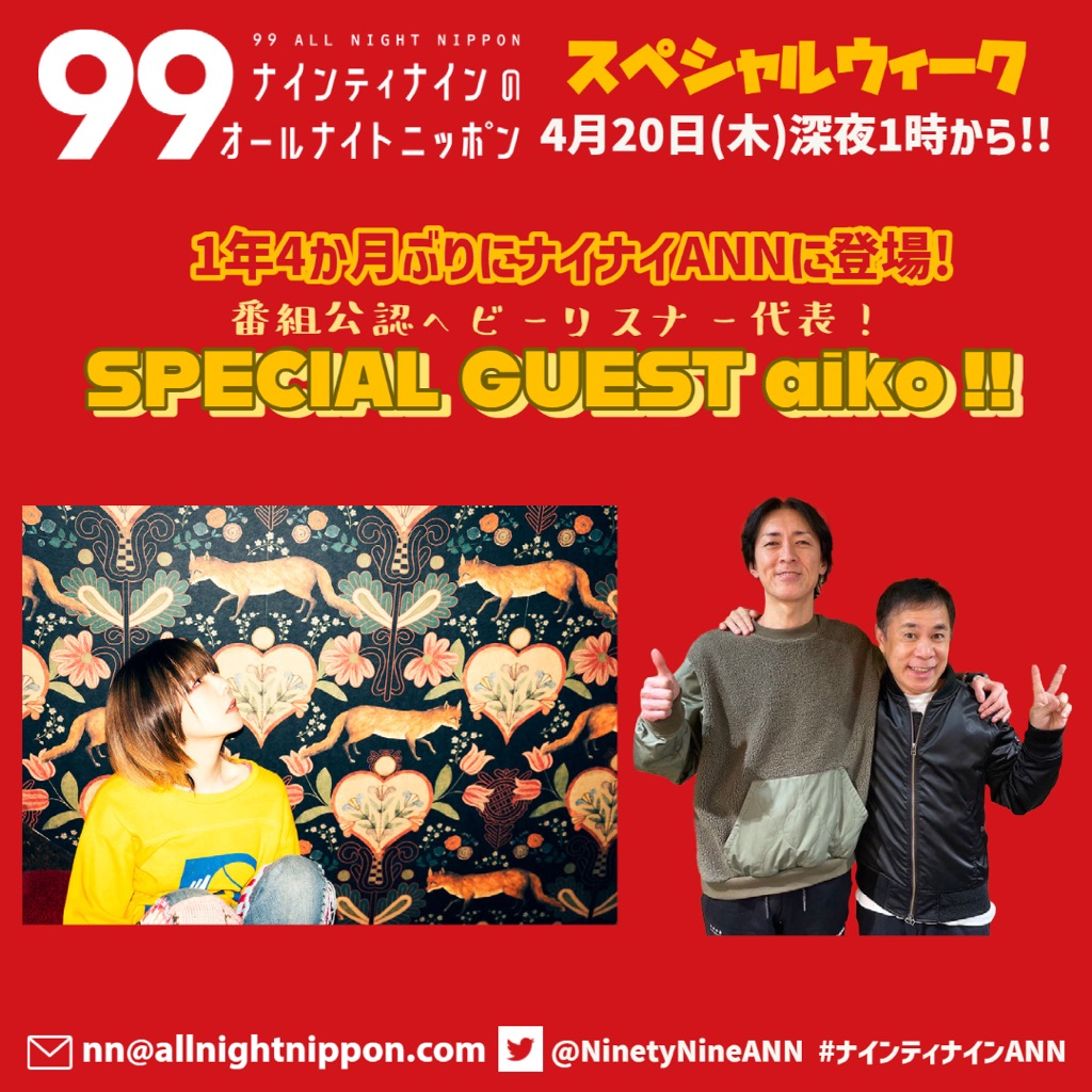 aikoが生出演する 『ナインティナインのオールナイトニッポン』は 4月20日(木)深夜1時から ニッポン放送をキーステーションに 全国36局ネットで生放送される。