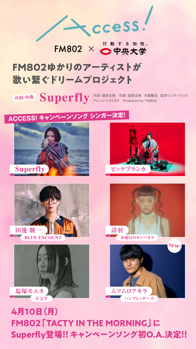 <ACCESS!>キャンペーンでは毎年、FM802とゆかりのあるアーティストが多数参加するオリジナル・キャンペーンソングを制作し、期間限定で独占オンエアしている。2023年のキャンペーンソングには、作詞と作曲も手がけるSuperflyをはじめ、詩羽(水曜日のカンパネラ)、塩塚モエカ(羊文学)、田邊駿一(BLUE ENCOUNT)、ビッケブランカ、ムツムロアキラ(ハンブレッダーズ)が参加するそうだ。