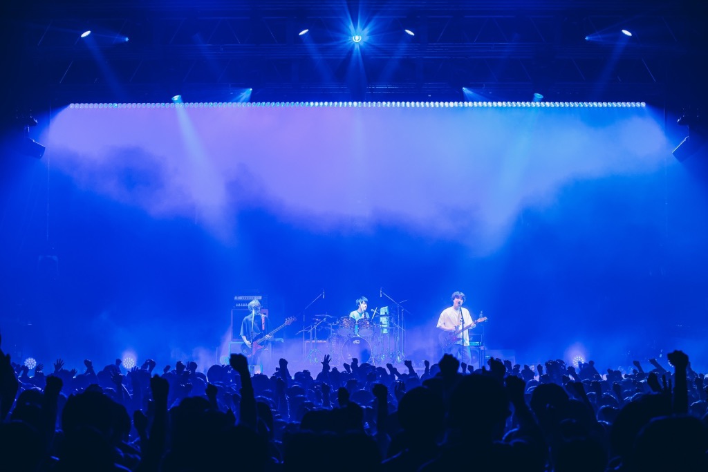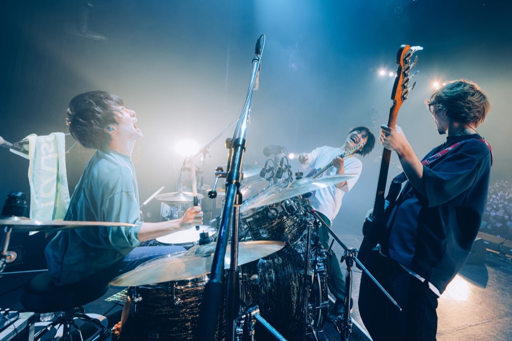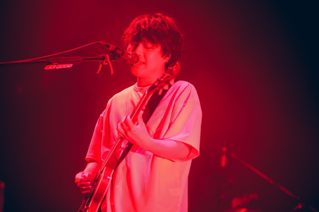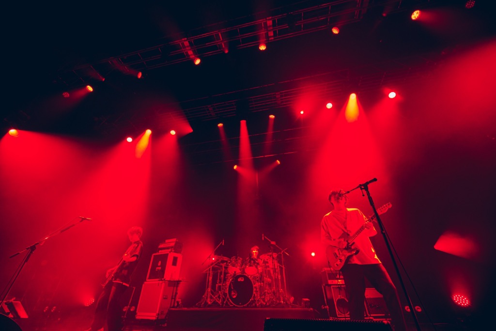 「結び」「ベイビー」とじっくり聴かせる曲が続いたところで、ギターを弾きながら菊池が話し始める。この3ヶ月、ひたすらライブを続けてきた日々を「楽しかったけど、すごく辛かった」と告白する一方、今日この日を迎えられて「報われた」とも語る。「1本重ねるごとに、俺たちはどんどん強くなっていっていると思います。全部が意味のあることなんだと思っています」――そういうと、現在活動を休止している菊池竜静(Ba, Cho)のことにも触れつつ「それはずっと3人でやっていくための答えです」と前を向く。「俺たち、このツアー23本、それだけじゃなくてずっと、本物のかっこいいロックバンドになってやるっていう気持ちでずっと鳴らしてきました。23本全部、最高のグルーヴを作ってこれたと思います」。言葉が熱を帯びるに従って、音も分厚く、鋭くなっていく。そのまま「私、結婚するかも」へと流れ込むと、フロアからは堰を切ったように手拍子が鳴り出した。真っ赤なライトに照らされる中、会場がひとつになっていく。