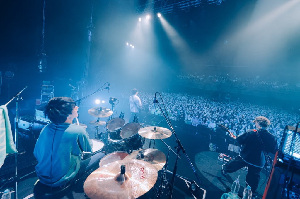 続けて「距離」のアッパーなサウンドで一気に盛り上げると、さらに「アイムアイ」へ。イントロのハイハットに合わせてフロアからは手拍子が巻き起こる。そのリズムを繰り出している鹿又輝直(Dr.)のプレイも大迫力。感情を豊かに表現しながら、躍動するようにスティックを操っている姿が印象的だった。