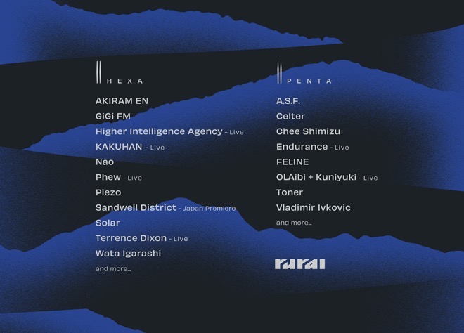 第1弾ラインナップではピエゾ、ウラジミール・イヴコヴィッチ、ソラー、Phew、Wata Igarashiらを発表した<rural>。今回第2弾ラインナップとして、2000年代半ばのミニマルブームを牽引したレーベル兼アーティストユニットのSandwell District(レジスとファンクション)が復活を遂げて、その日本初公演を<rural>で実現。また90年代からデトロイトで活動するテクノプロデューサー、テレンス・ディクソンが初来日。さらに90年代からオウテカやオービタルらも活動していたクラブ「Oscillate」にて中心的な役割を担っていたボビー・バードによるプロジェクト“ハイヤー・インテリジェンス・エージェンシー”がライブセットで来日する。そして昨年熱海「ニューアカオ」のスピンオフ版<rural>で鮮烈な初来日デビューギグを成功させたGiGi FMが再来日も。
