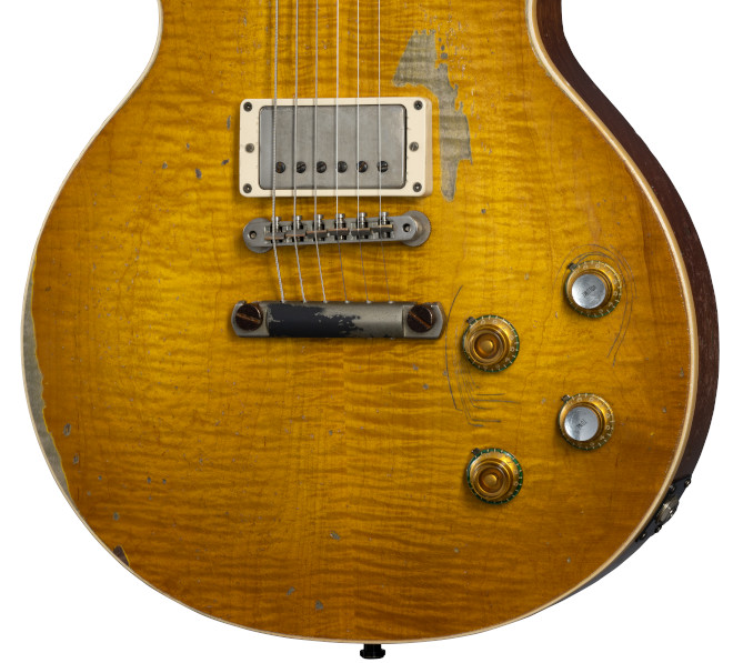 “グリーニー”は、これまでに作られたオリジナル・レスポール・スタンダードの中でも最もアイコニックな1本で、一音でわかる唯一無二な音色を備える。元々はピーター・グリーンが所有しており、フリートウッド・マック在籍時に使用され、その後ゲイリー・ムーアに売却され、シン・リジー在籍中やソロ・アーティストとして30年間使用された。現在はカーク・ハメットが所有しており、“グリーニー”はまさに3人の伝説的なギタリストの手に渡っている。“グリーニー”はネックピックアップのマグネットを反転させているため、ミドル・スイッチのポジションでアウト・オブ・フェイズになり、特徴的なサウンドを生み出す。