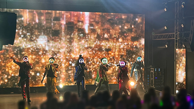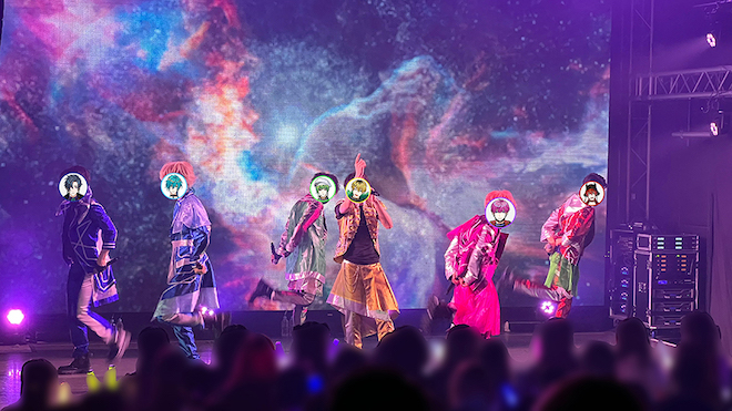初めての顔出しでライブということもあり、会場は一目見ようと集まった観客で満員状態。Overtureがフロアに鳴り響くと色とりどりのペンライトがリズミカルに動き出し、メンバーカラーのカラフルな衣装を着た6人が黒マスク姿で登場した。記念すべき1曲目はプレデビュー第5弾の最新曲「BUZZ」からスタート。流れるようなラップと歌に、曲中で何度も聞こえる「BUZZ IT BUZZ IT」の掛け声が中毒性を高め、いきなり観客の心を鷲掴みに。2曲目はプレデビュー第2弾「Universe」を披露。緩急のあるダンスと、幻想的なVJ TONTONの即興で生み出された映像演出をバックに熱唱する6人の表情が眩しい。